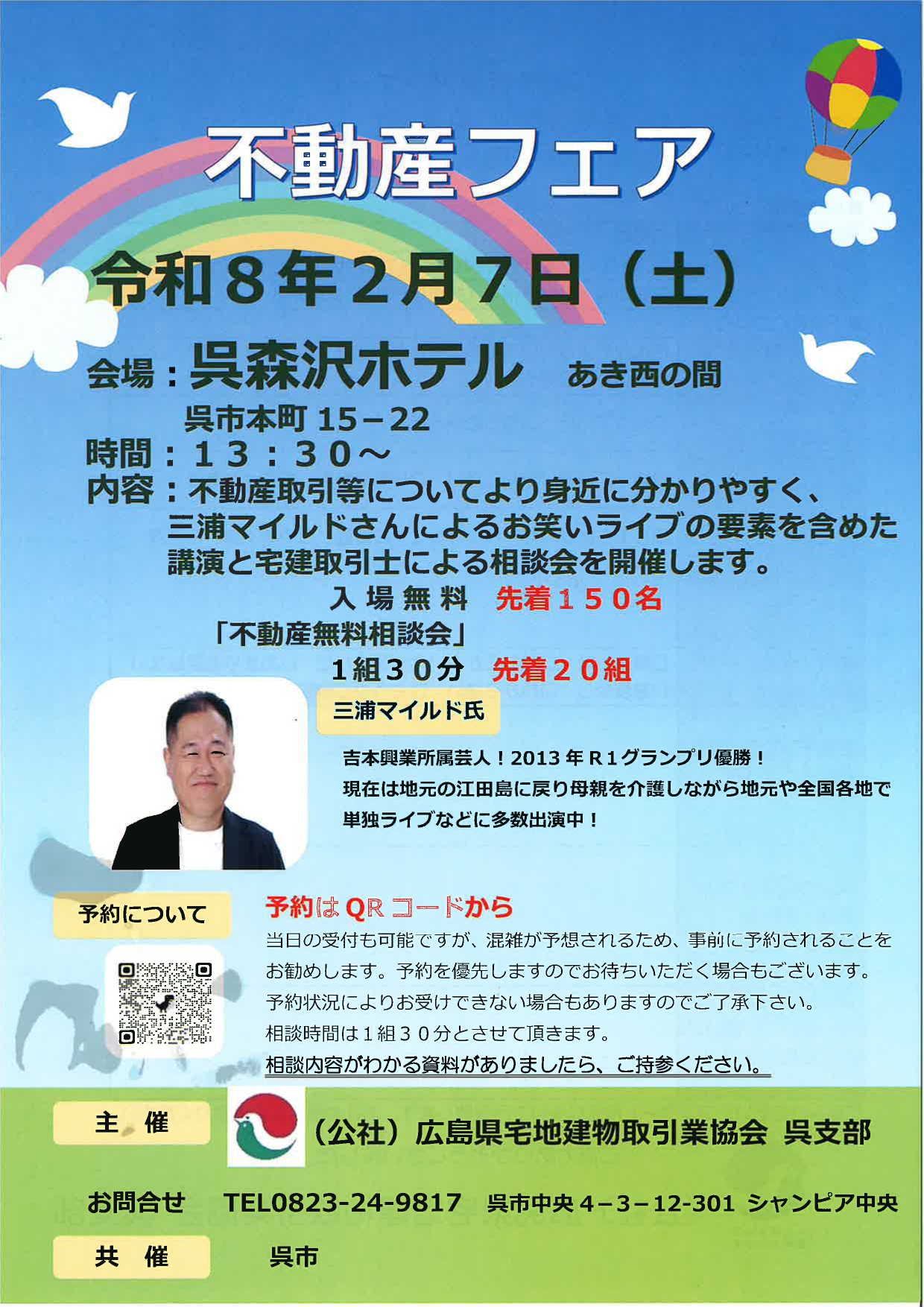 開催日:令和8年2月7日(土)13:30~ 開催場所:呉森沢ホテル 宅建協会呉支部による不動産フェアが開催されます。 是非...