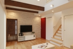 色味を抑えながらも物足りなく感じないのは、テレビ背面の壁にタイルを貼り、吹抜けにデザイン性の高いスリットを配し、また和室が格子扉から透けて見えるなど遊び心が散りばめられているから。ビビッドな赤いリビングドアは枠の無いアウトセットスタイル。